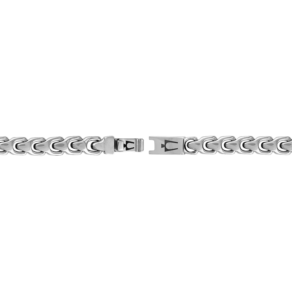 Destined to become a classic, the exclusive Bulova Link™ Collection proudly features our historic tuning fork as its signature design element. This striking 8MM bracelet in polished stainless steel offers a bold yet timeless look. Features a box lock clasp etched with Bulova's iconic logo. Measures 7.5"" in length.
