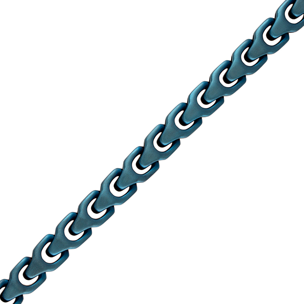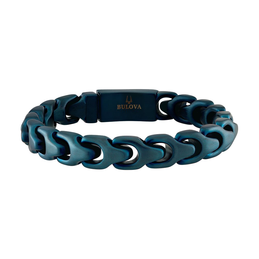The exclusive Bulova Link™ Collection proudly features our historic tuning fork as its signature design element. Distinct and bold, this 8MM stainless steel bracelet stands out in an eye-catching blue satin finish. Features a box lock clasp etched with Bulova's iconic logo. Measures 8.5"" in length.