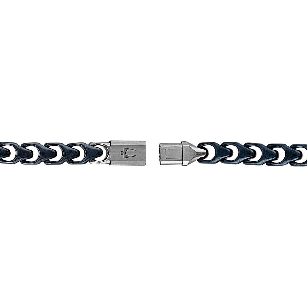 The Bulova Link ™ Collection gets trendy in two tones Capturing the essence of our tuning fork logo, this 8MM polished stainless steel bracelet makes a winning statement in a combination of navy blue and steel. A fabulous layering piece or perfect on its own. Measures 8.5"" in length with a magnetic closure etched with Bulova's signature tuning fork logo.