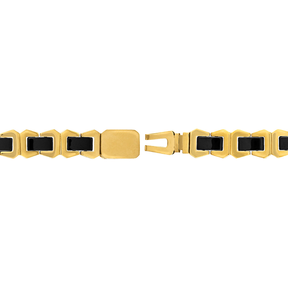 This bracelet is traditional yet contemporary in gold-tone stainless steel and black ceramic. Crafted with our tuning fork shaped links featuring a custom-designed clasp with tongue in the shape of the Bulova signature tuning fork. Reverse side of clasp is branded with our iconic logo. Bracelet measures 8.5""