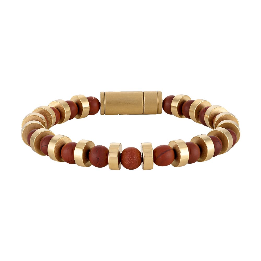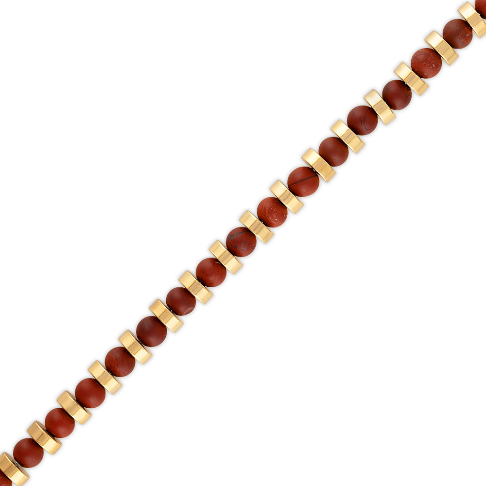 Beaded bracelet with alternating gold-tone steel discs and beads of matte red jasper, a powerful protective stone believed to promote healing and stability. Features a magnetic closure in gold-tone stainless steel branded with our iconic logo. Use as a stand-alone piece or as the perfect addition to achieve a layered look. Measures 8"" in length.