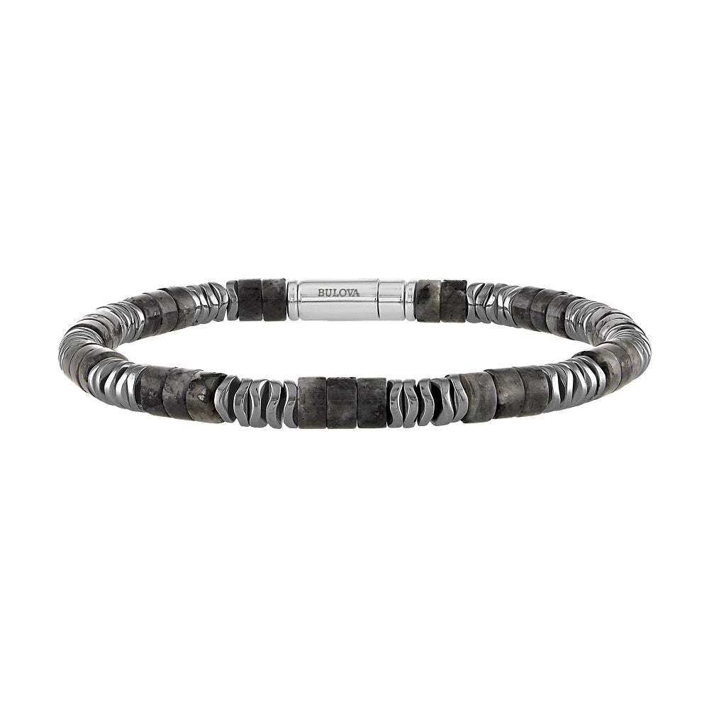 Monochromatic, cylinder-shaped beaded bracelet 8.5"" in length made of labradorite, a mystical stone believed to enhance mental clarity, relieve stress and promote healthy sleep. Alternating sections of wavy stacked hematite discs (thought to promote stability and optimism) and crafted with a magnetic cylinder clasp in sterling silver.