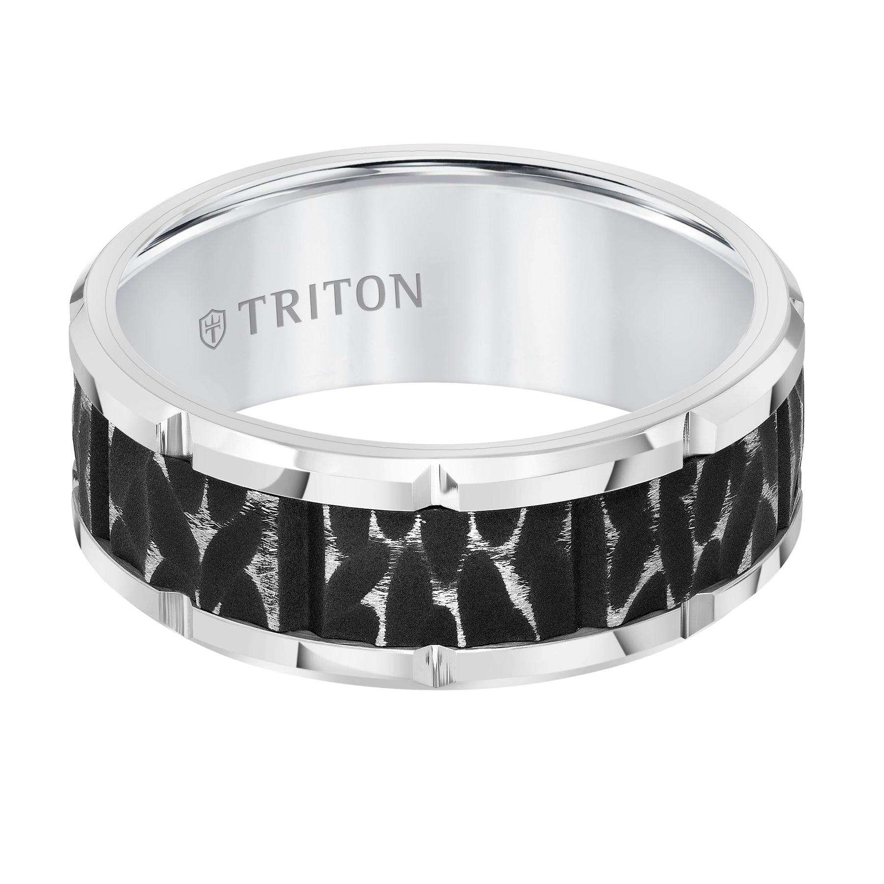 9MM Tungsten Carbide Comfort Fit Mens White Band with Black Sand Blasted Textured Center with Flat Profile and Bright Cut Rims