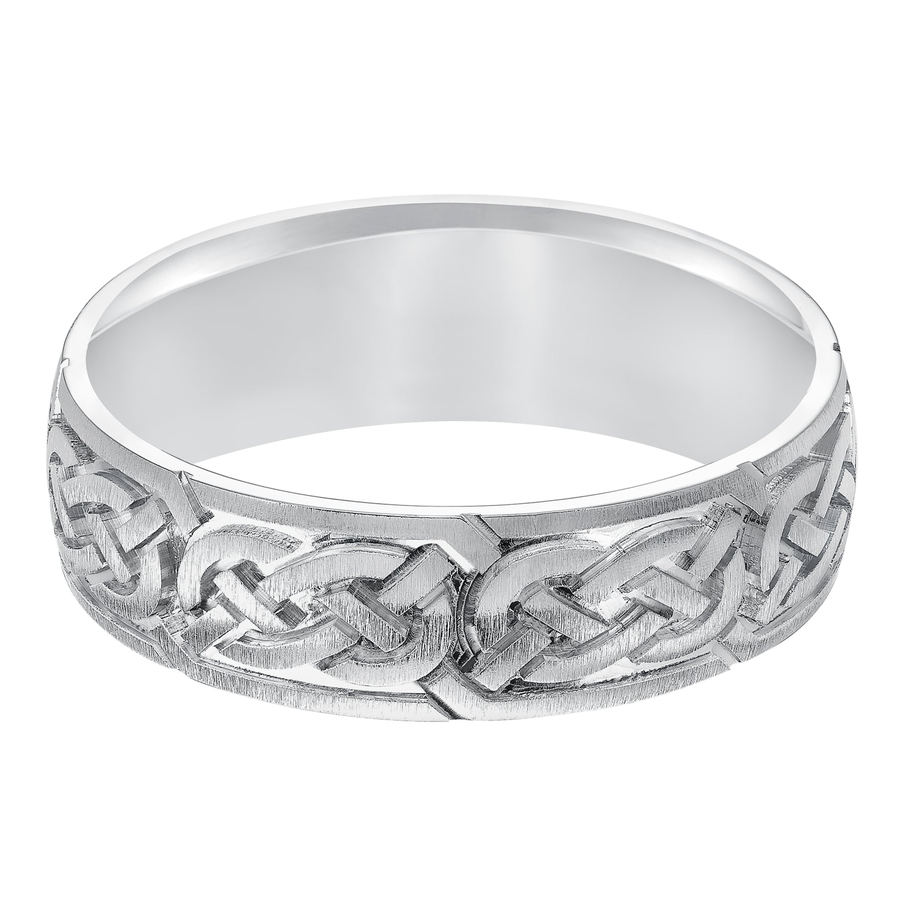 This finely crafted, Comfort Fit wedding band features an exquisite Celtic knot design, satin finish and flat edges to complete the look