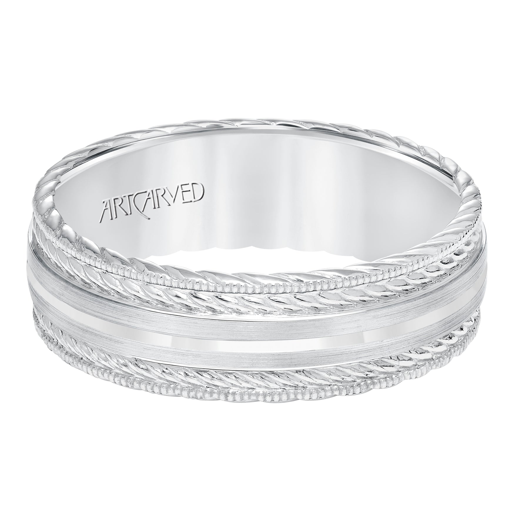Mens wedding band with satin finish and milgrain edge, rope treatment on top and the sides with flat profile.