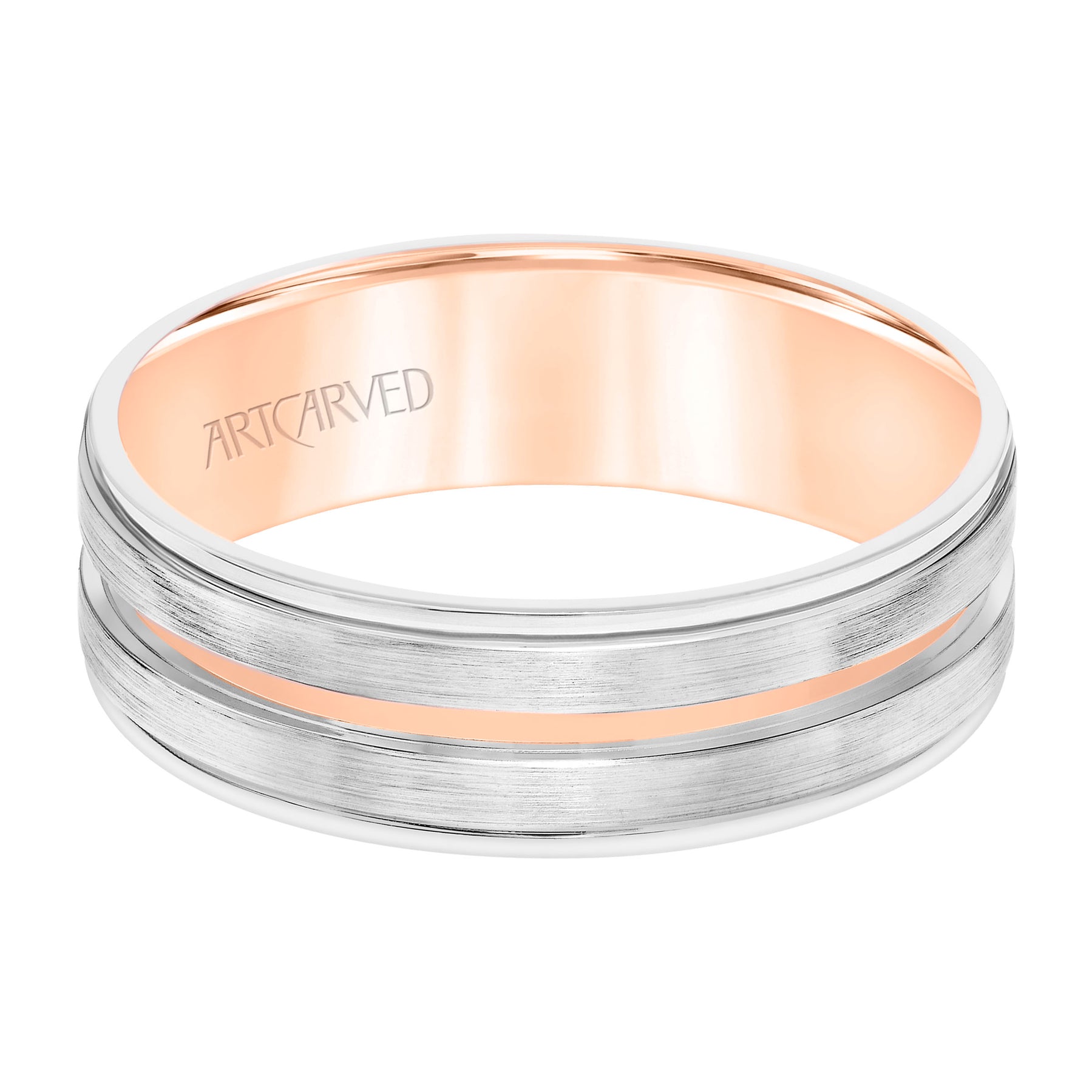 Mens Comfort Fit Wedding Band with White Gold Exterior with Brushed Finish and Polished Cut Center with Polished Round Edge and Rose Gold Interior
