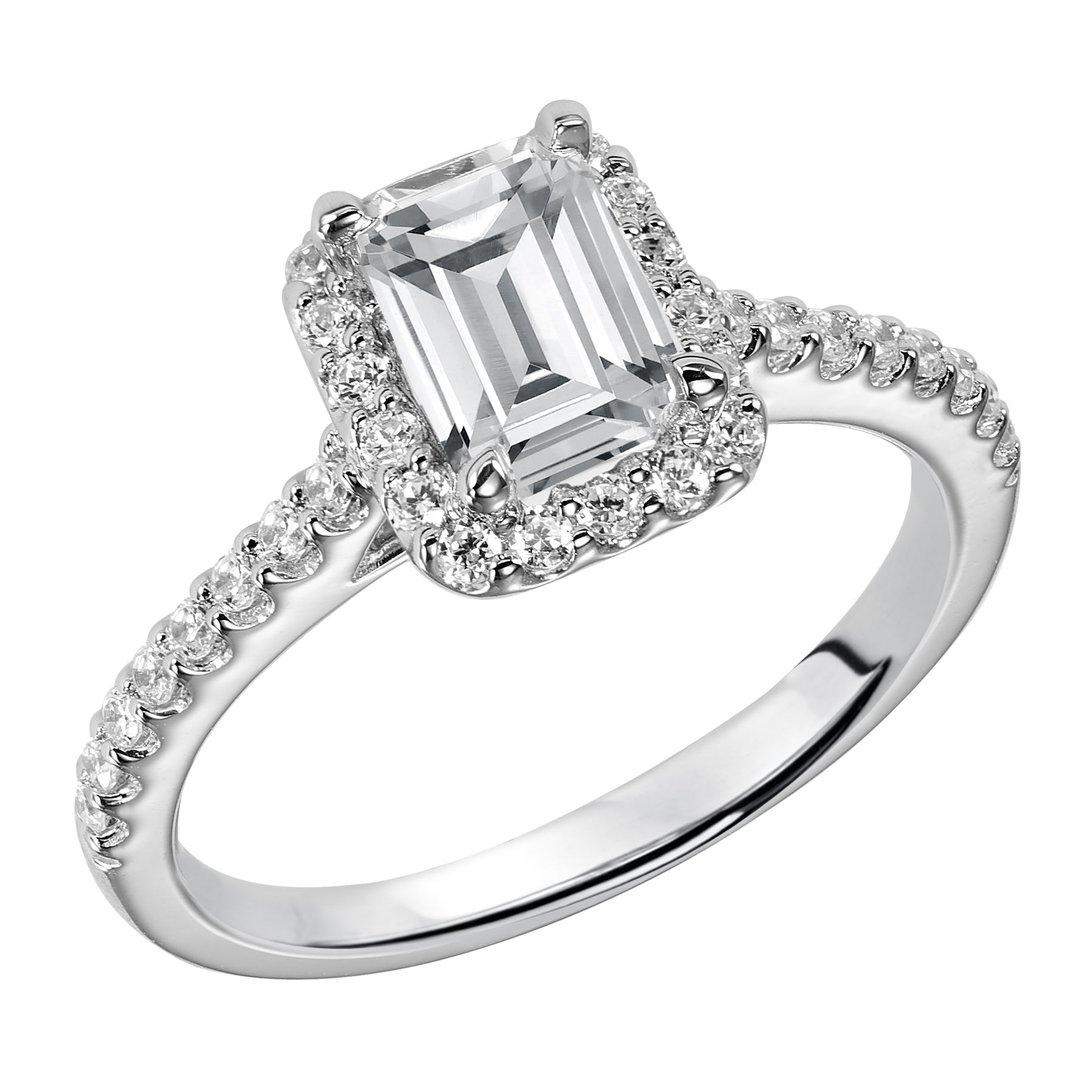 This timeless engagement ring features a diamond exquisitely enhanced with a prong set diamond halo and band