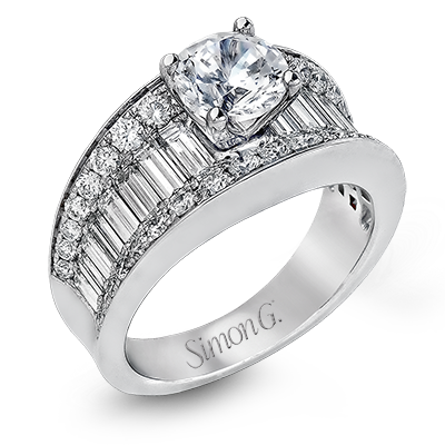 This eye-catching contemporary white gold engagement ring is accented by .75 ctw round cut white diamonds and 1.26 ctw baguette white diamonds for an unforgettable look. Center stone not included. Our rings can be designed to fit any center stone.