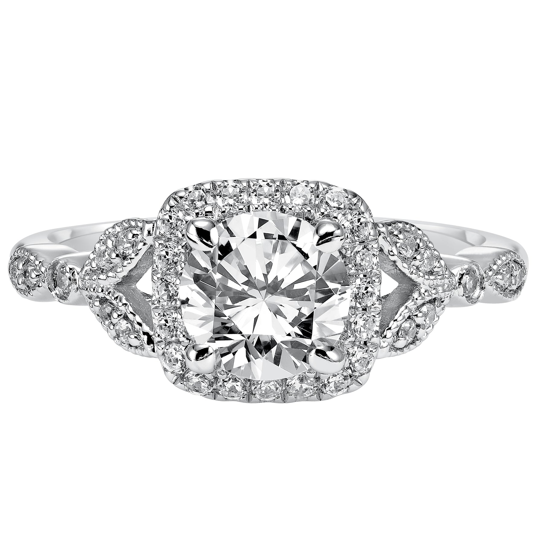 This whimsically styled engagement ring sparkles with its filigree and diamond halo and diamond prong set floral-inspired band