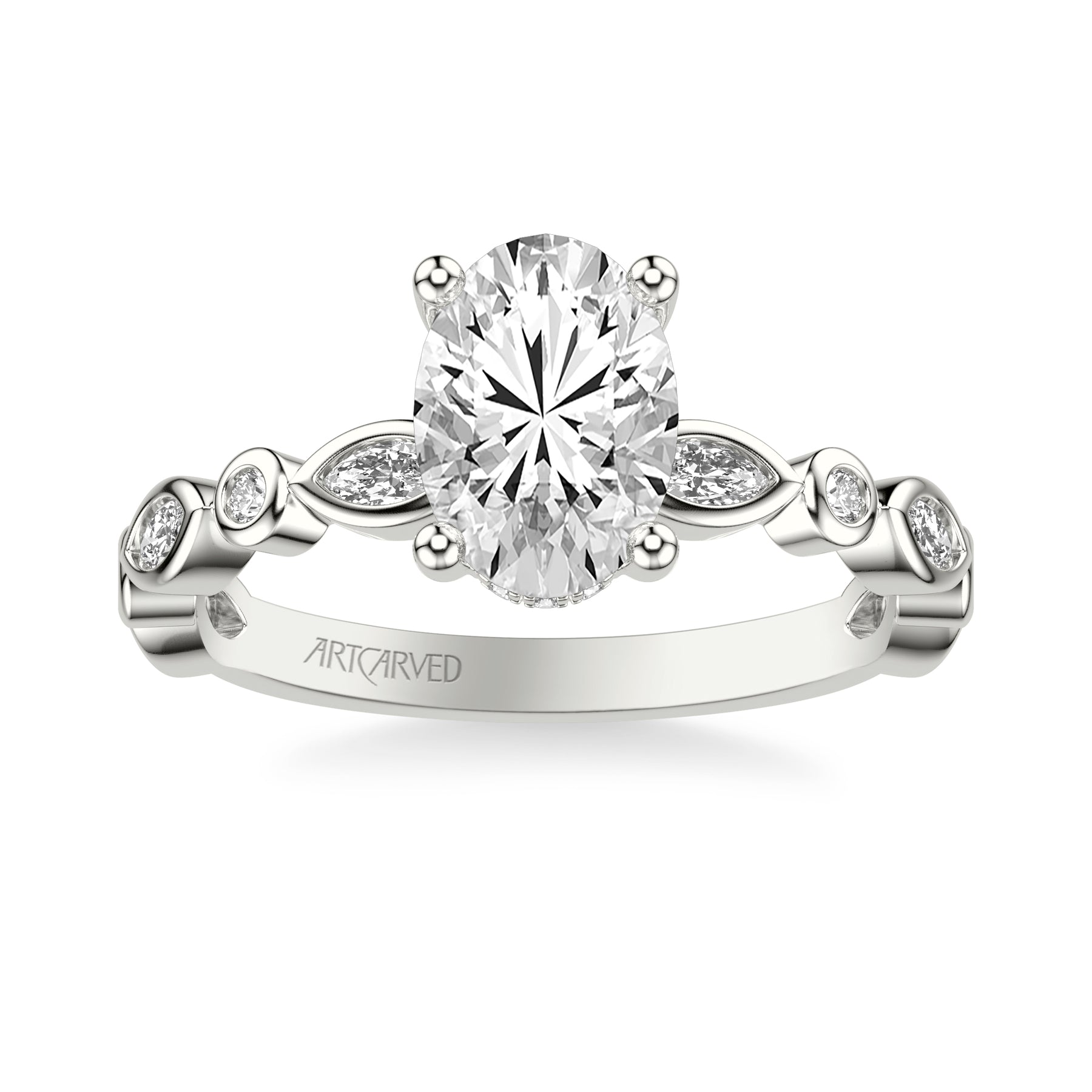 Floral Engagement Ring with Hidden Diamond Halo and Alternating Bezel Set Marquise and Round Diamonds
