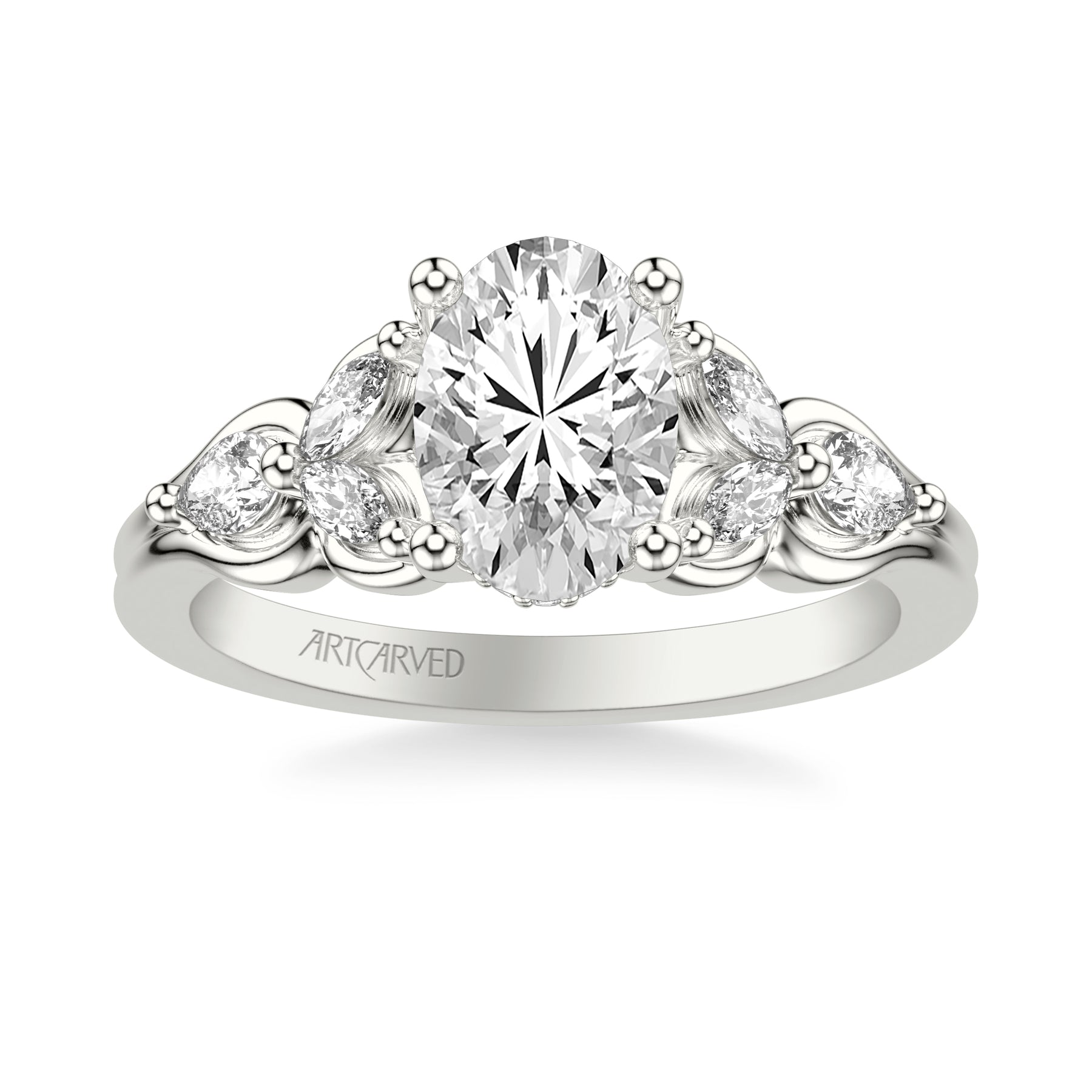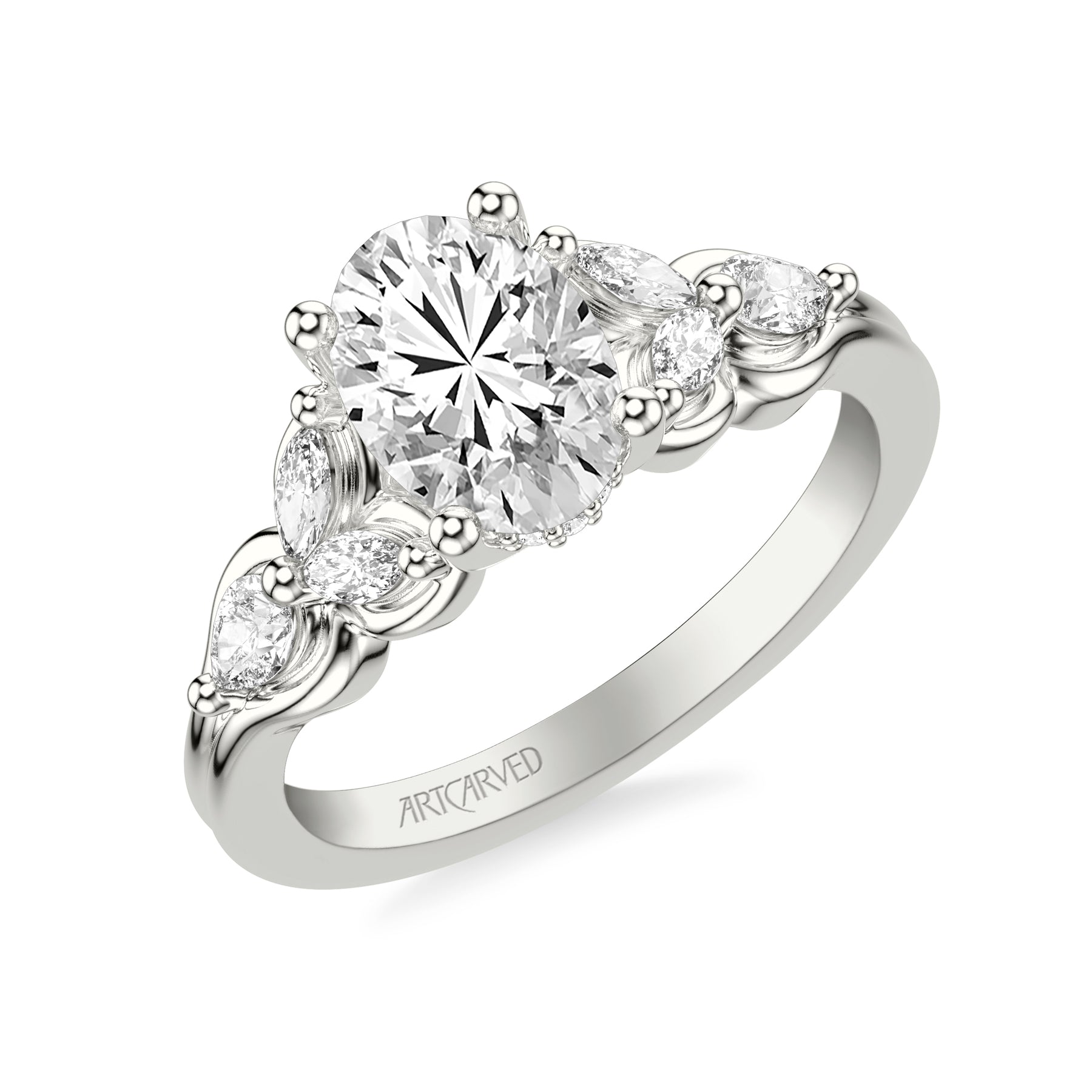 Floral Engagement Ring with Bezel Set Marquise Diamond Petals and Pear Diamond Accents with Double Row Polished Shank