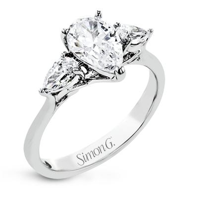This distinctive three stone ring is new take on a classic style, with .45 ctw of pear shaped side diamonds highlighting the pear shaped center stone. Center stone not included. Our rings can be designed to fit any center stone.