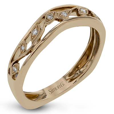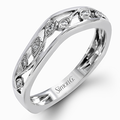 Set with delicate floral patterns, this classic white gold engagement ring is highlighted with .12 ctw round cut white diamonds. Center stone not included. Our rings can be designed to fit any center stone.