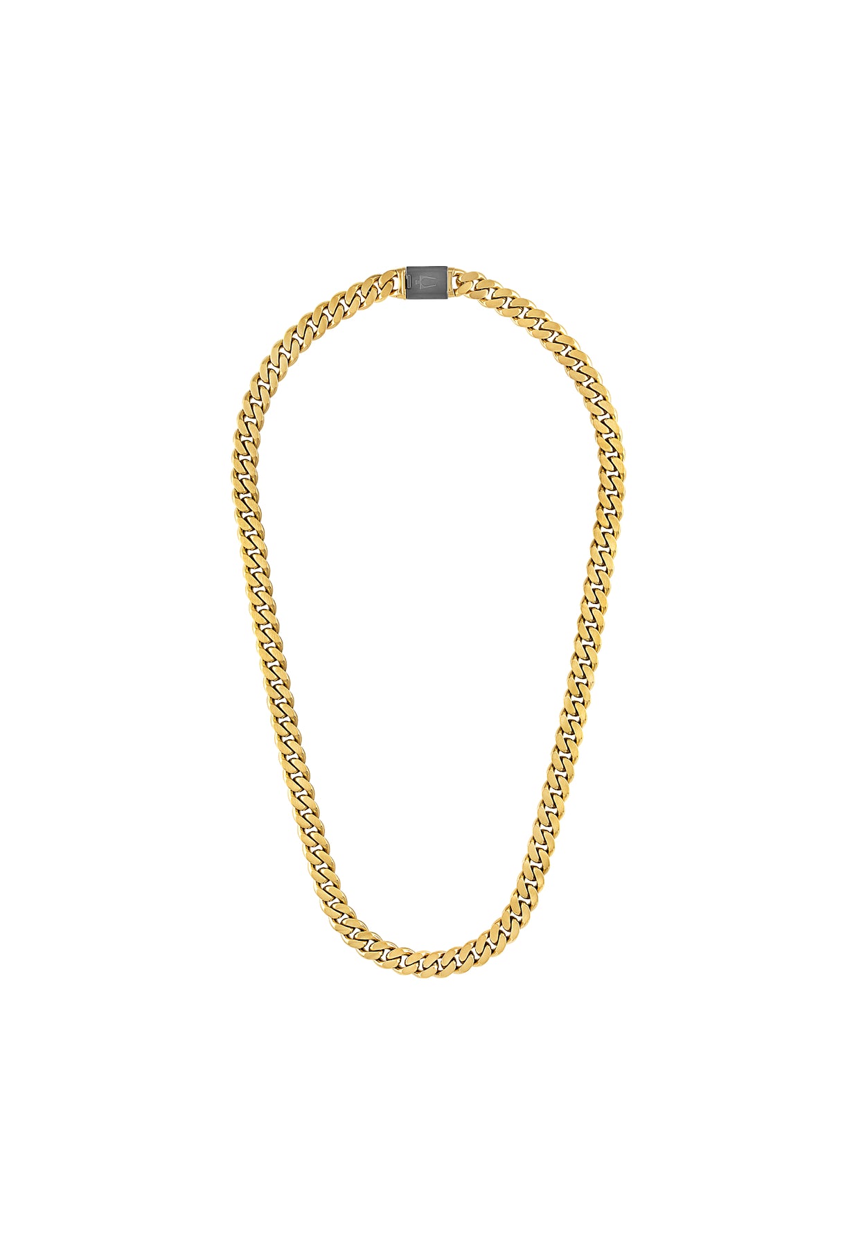 A classic Bulova curb chain of dual-surfaced links updated in a striking black and gold color combination. Distinctly bold 24"" necklace made of 10MM gold-tone stainless steel combines both polished and brushed finishes. In an eye-catching black color, the custom-designed clasp with tongue in the shape of the Bulova signature tuning fork is subtly branded with our iconic logo.