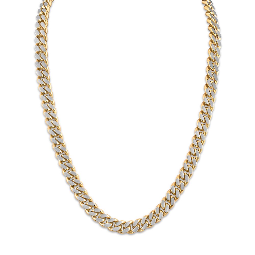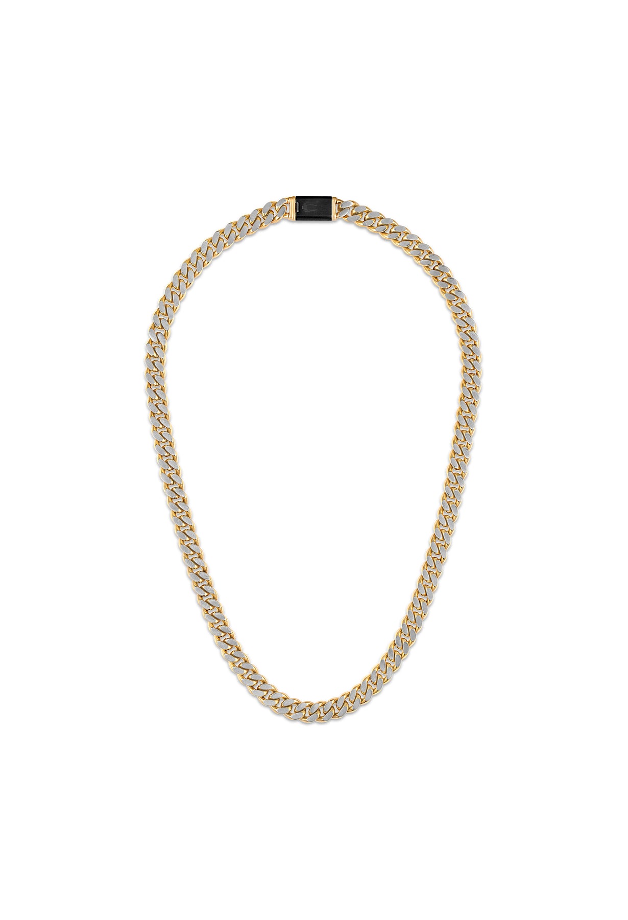 Timeless Bulova curb chain of dual-surfaced links featured in a new two-tone color. Distinctly bold necklace made of 10MM stainless steel in a polished gold-tone and brushed steel color combination. In an eye-catching gunmetal color, the custom-designed clasp with tongue in the shape of the Bulova signature tuning fork is subtly branded with our iconic logo. Measures 24"" in length.