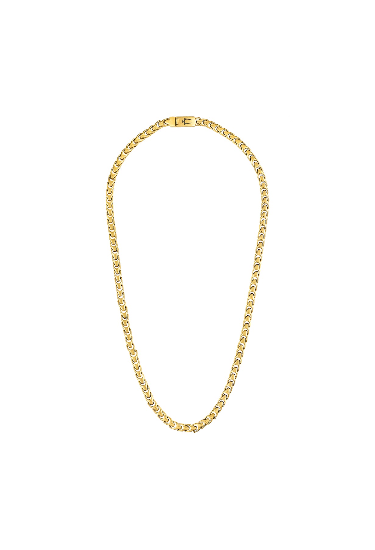The fresh new Bulova Link™ Collection abounds in both personality and presence as our iconic tuning fork makes its debut as a signature design element. Destined to become a classic, this sleek and stylish 8MM gold-tone stainless steel necklace makes a bold statement. Measures 24"" in length and features a box lock clasp etched with Bulova's iconic logo.