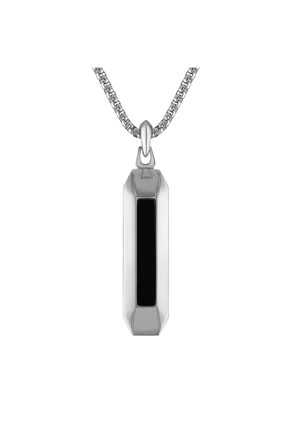 An elongated dog tag amulet made of stainless steel prominently features black onyx, a semi-precious stone of protection, believed to promote physical strength and stamina. Rounded box link chain necklace in stainless steel adjusts from 24"" to 26"" with extender ring and tuning fork shaped clasp. Pendant is subtly etched with Bulova's iconic logo and measures 40MM L x 11MM W.