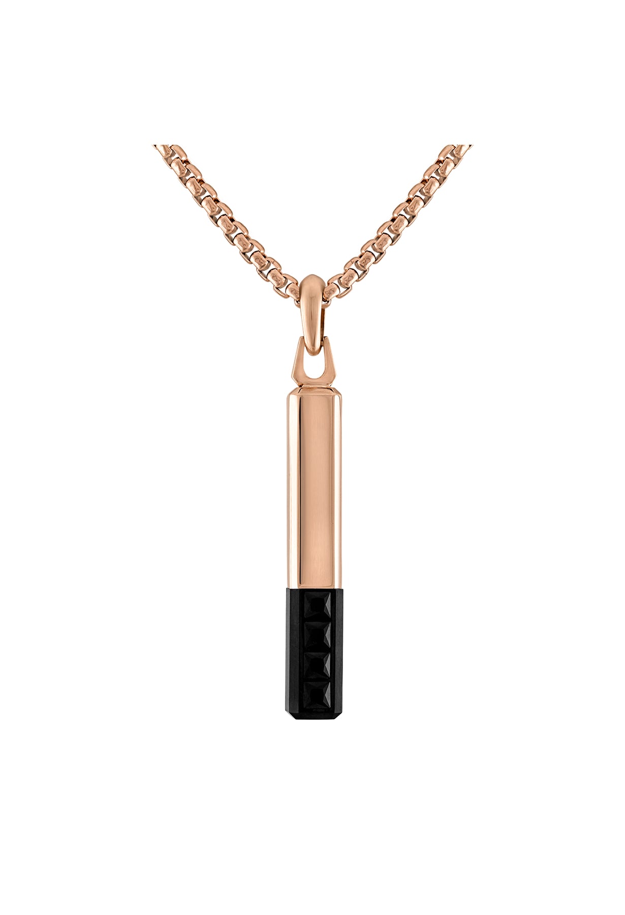 A bar-shaped amulet made in a stunning dual combination of black and rose-tone stainless steel suspended from Bulova's iconic tuning fork. Inlaid with faceted stones of black spinel, a rare gemstone believed to repel negativity while providing inspiration and empowerment. Rounded box link chain necklace in rose-tone stainless steel adjusts from 24"" to 26"" with extender ring and tuning fork shaped clasp. Pendant is subtly branded with the Latin GRAMMY® logo and measures 38MM L x 6MM W.