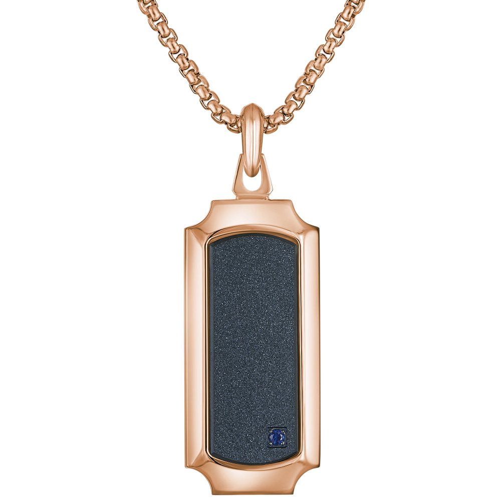 Part of the Bulova 150 Year Anniversary collection, this two-tone elongated dog tag pendant will certainly make an impression. Combination of matte and polished rose-tone stainless steel surrounds a textured navy blue center, accented with one lab-created blue sapphire 0.03 CTTW. Reverse side etched with 150BULOVA™ and tuning fork logo. Rounded box link chain necklace in polished rose-tone stainless steel adjusts from 24"" to 26"" with extender ring and tuning fork clasp.