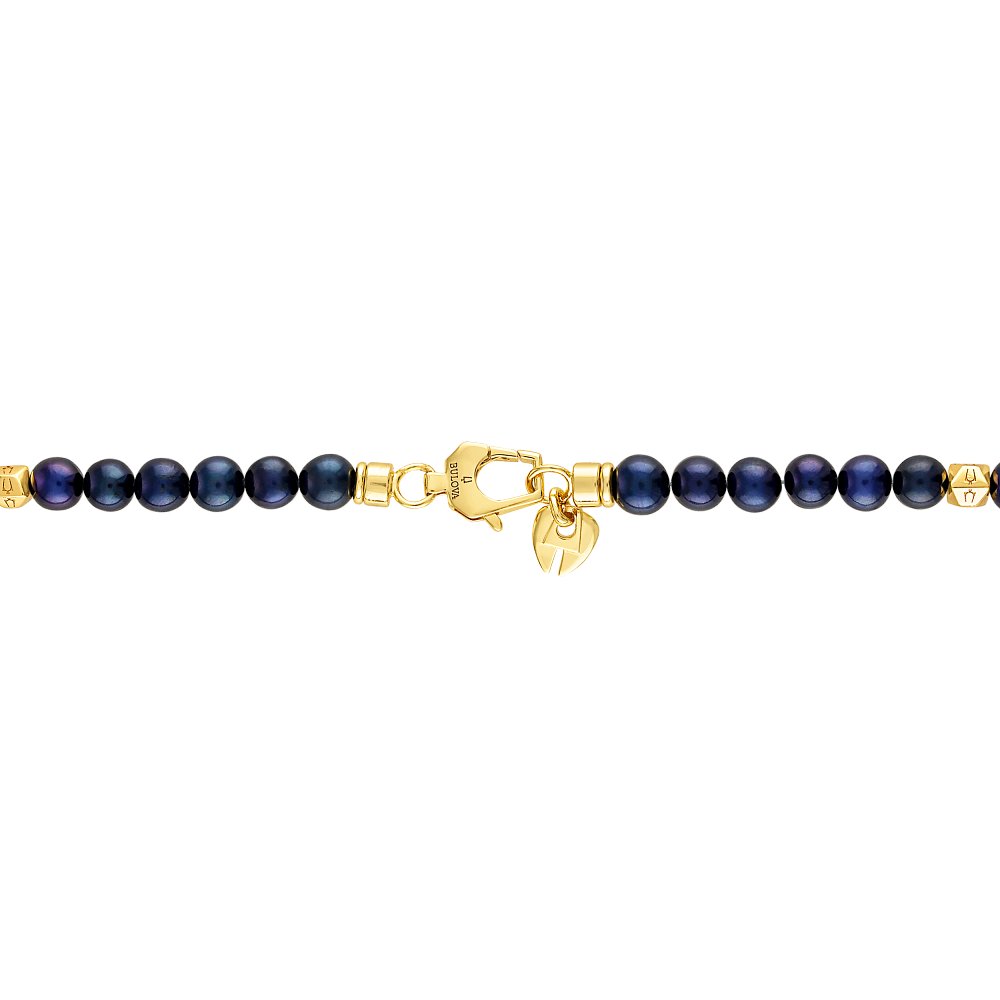 Matte black freshwater pearls in a beaded 22"" necklace accented with 3 black ruthenium-plated sterling silver beads set with white diamonds totaling 0.28 CTTW, and contrasted by 6 gold-tone hexagonal spheres etched with Bulova tuning fork icon on all sides. Magnetic cylinder clasp in 14K gold-plated sterling silver etched with iconic tuning fork logo.