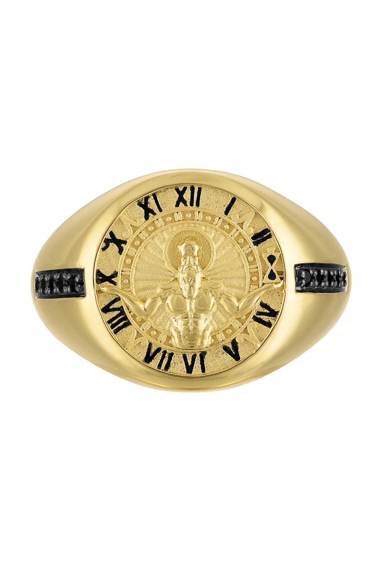Statement ring in polished 14K gold-plated sterling silver features a raised image of Chronos, the god of time, holding an hourglass and encircled by Roman numerals on a clock. Accented on both sides with a vertical inlay of black diamonds totaling 0.10 CTTW. Interior design inspired by Bulova's iconic tuning fork logo. Ring top measures 16MM in diameter. Size 11.