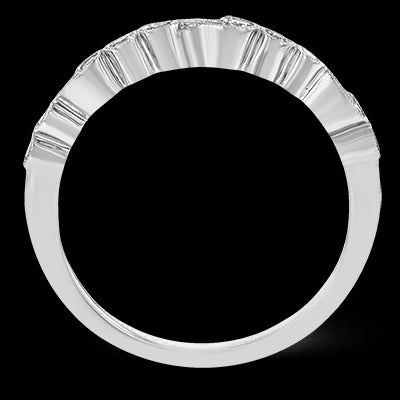 This vintage inspired 18k white gold ring contains .11 ctw of round white diamonds in a delicate swirling design. Perfect for stacking.