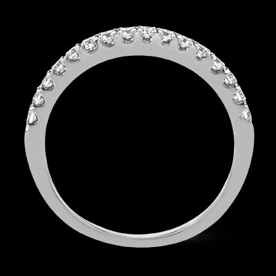 Playful and modern, this white gold wedding set sparkles with .31 ctw of round white diamonds highlighting the center stone. Center stone not included. Our rings can be designed to fit any center stone.