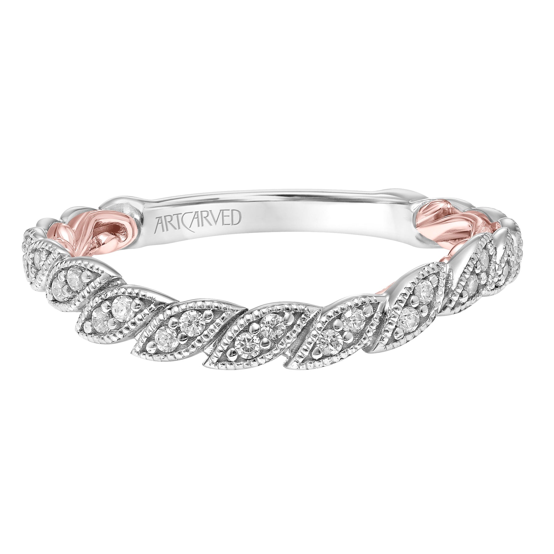 Lyric Curved Wedding Band with Milgrain Vine Motif Diamond Accents